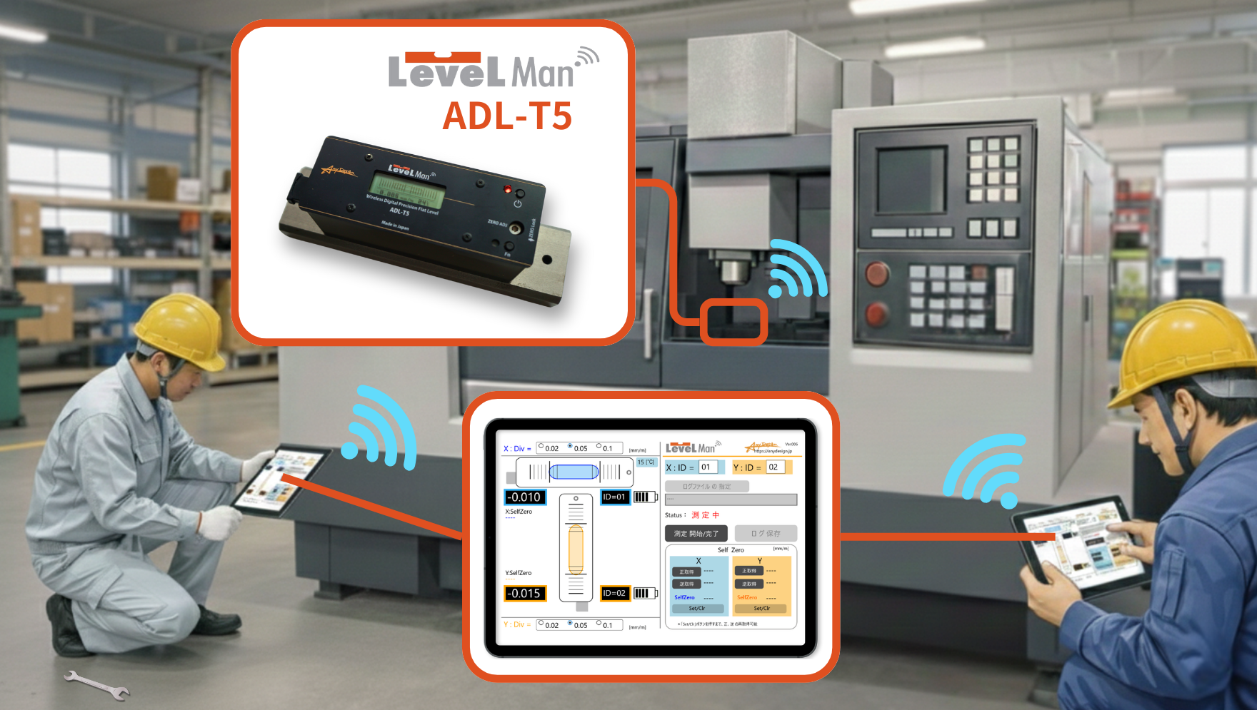Any Designが開発したデジタル精密水準器「LevelMan」は、独自の無線通信と専用アプリケーションにより、複数地点の測定結果をリアルタイムで共有できるシステムです。