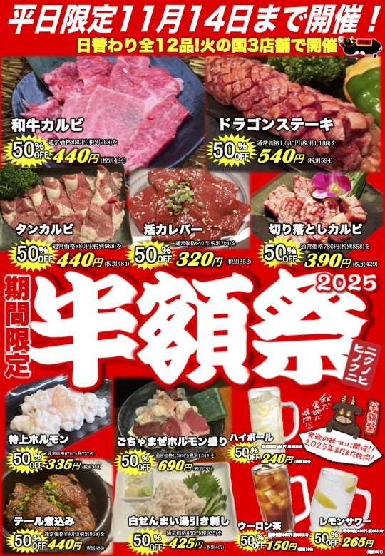 浜松の老舗焼肉【火の国】の超お得な半額祭! 人気メニューをお得に楽しめる平日限定キャペーンを 10/1(水)~11/14(金)に開催 | NEWSCAST