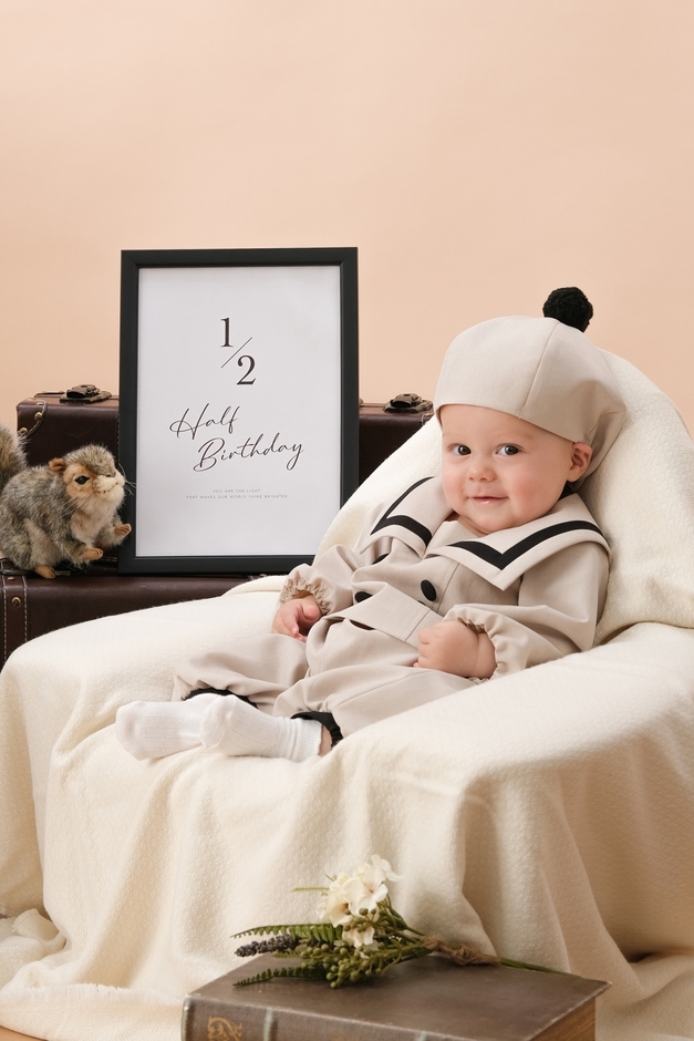 ハーフバースデーならではの可愛さを引き立てるアイボリーやベージュの優しい色味と素材感を使用したナチュラル感のある衣装になっています。