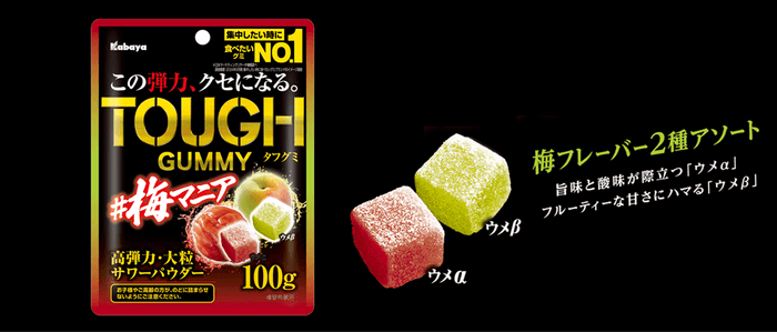 『タフグミ 梅マニア』は、飽きずに続けて食べたくなる連食性を生み出すために、旨味と酸味が際立つ「ウメα」と、フルーティーな甘さにハマる「ウメβ」の2種フレーバーが1つのパッケージに入っています。