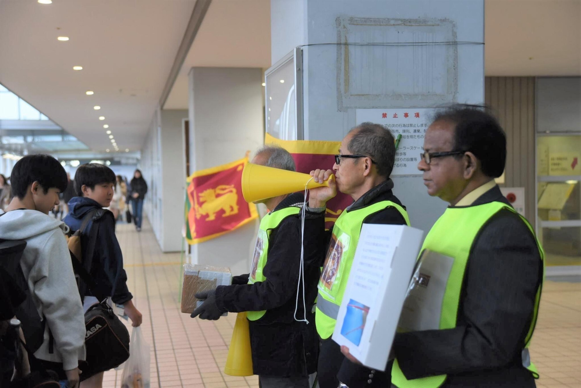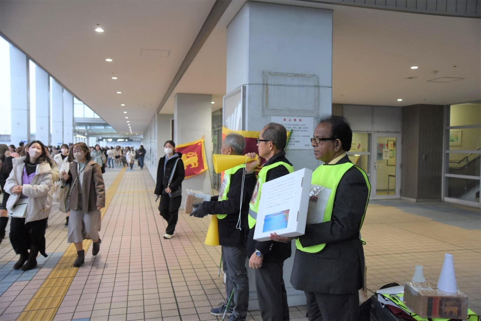 スリランカで11月末に発生した豪雨災害の被災者を支援しようと、本学の教員や学生らが12月20日、名古屋市東区のナゴヤドーム南北ペデストリアンデッキで、募金を呼び掛けるボランティア活動を行いました。本学外国語学部の初代学部長でスリランカ在住のアーナンダ・クマーラ名誉教授も駆けつけ、参加者は「スリランカの人たちは豪雨被害で大変な思いをされています。募金にご協力をお願いします」と市民に訴えました。