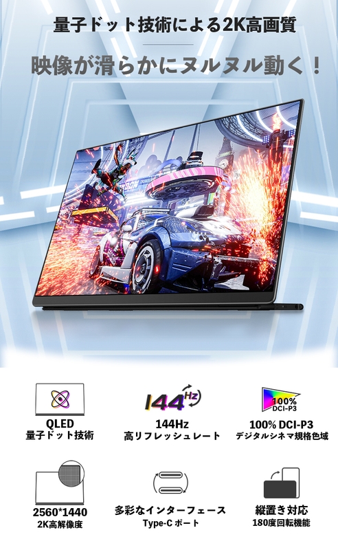 QLED(量子ドット技術)を採用した15.6インチの2Kモバイルモニターです。リフレッシュレートは144Hz(応答速度は1ms)のため、FPS・TPS等のゲームやアクション映画等の動きが激しい映像に特化した商品です。一般的な60Hzモニターと比較すると、1秒間に120回の描き換えが可能なため、より繊細でダイナミックな動きを映像化できます。映像と映像の差が小さくなるので、より滑らかでヌルヌルとした映像表現ができます。アクション映画ではより迫力のある映像をお楽しみいただける他、FPS・TPS等のゲームではエイム精度が良くなります。