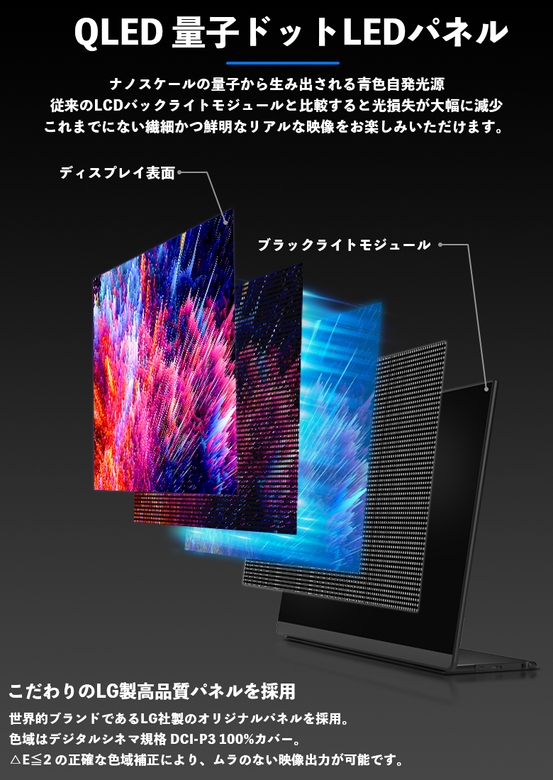 ネイティブ解像度は(2,560×1,600)とFHDに比べ、よりきめ細かい繊細な高画質映像をお楽しみいただけます。バックライトを量子ドットに照射し、ナノレベルで発行色をコントロールしているのではっきりとしたシャープなディスプレイ表現が可能。パネルはLG社製の高品質液晶IPSパネルを採用しており、視野角による輝度の変化がなく、178°の範囲でどの角度からも美しい映像をお楽しみいただけます。