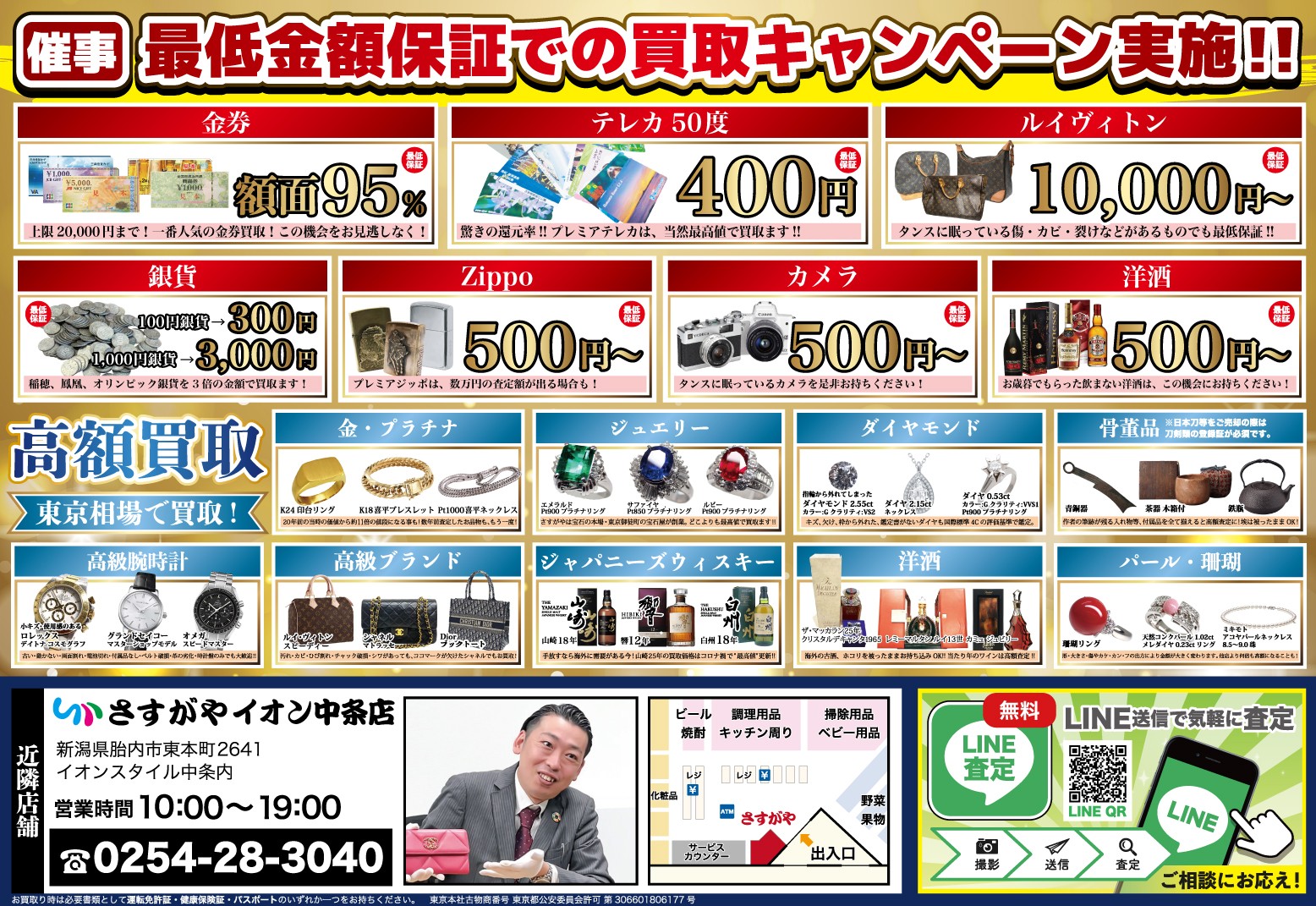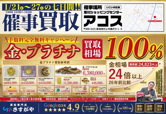村上市での催事では、最低買取価格保証に加え、金・プラチナ製品の相場100%買取を同時開催中です!