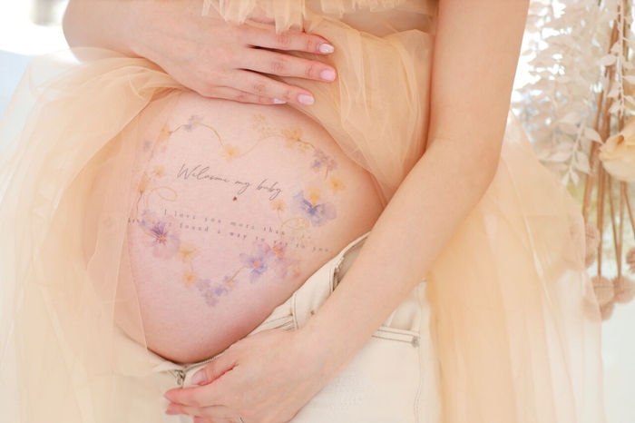 大きくなったお腹にマタニティペイントを施して赤ちゃんへのメッセージを添えて撮影される方もいらっしゃいます。実際にスタジオでボディーペイントを行っているわけではないですが、今ではペイント用のボディーシールもあるのでご興味のあるかたはぜひご検討ください。