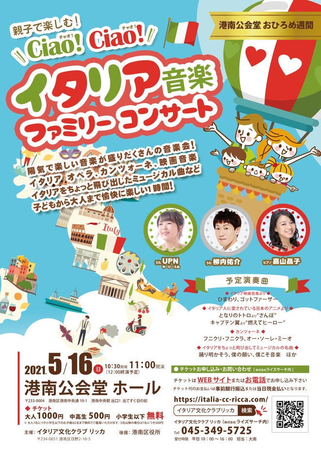 イタリア文化クラブ リッカ(所在地:横浜市港南区、代表:内田奈津子)は、建て替えのため休館していた港南公会堂のおひろめ週間にて「親子で楽しむCiao!Ciao!イタリア音楽ファミリーコンサート」を2021年5月16日(日)に開催し、この中で新曲としてイタリアの食文化を学ぶ楽しい楽曲「ボナペティート」を発表します。