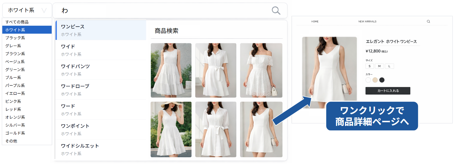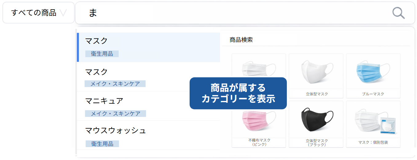 検索時に候補語のサジェスト表示と同時に、関連するカテゴリーと商品画像・ページプレビューを表示します。これにより、ユーザーは検索キーワードの入力段階から、目的の商品がどのカテゴリーに属しているか、Webサイトにどのような商品や情報があるのかを把握することができます。