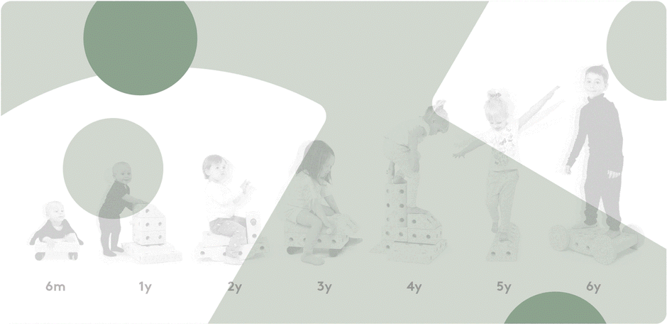 MODUは、デンマーク・コペンハーゲンを拠点とするデザイナーから生まれました。デザイナーの想いはたった一つ、子どもたちがずっと自由に遊べること。この想いから作り上げられたMODUの遊び方は、とてもシンプル。柔らかいEVAブロックやABS製バー、車輪を使って組み立てたり、身体を乗せたりして遊ぶだけ。だから、生後6ヵ月の子どもから楽しく遊べます。
