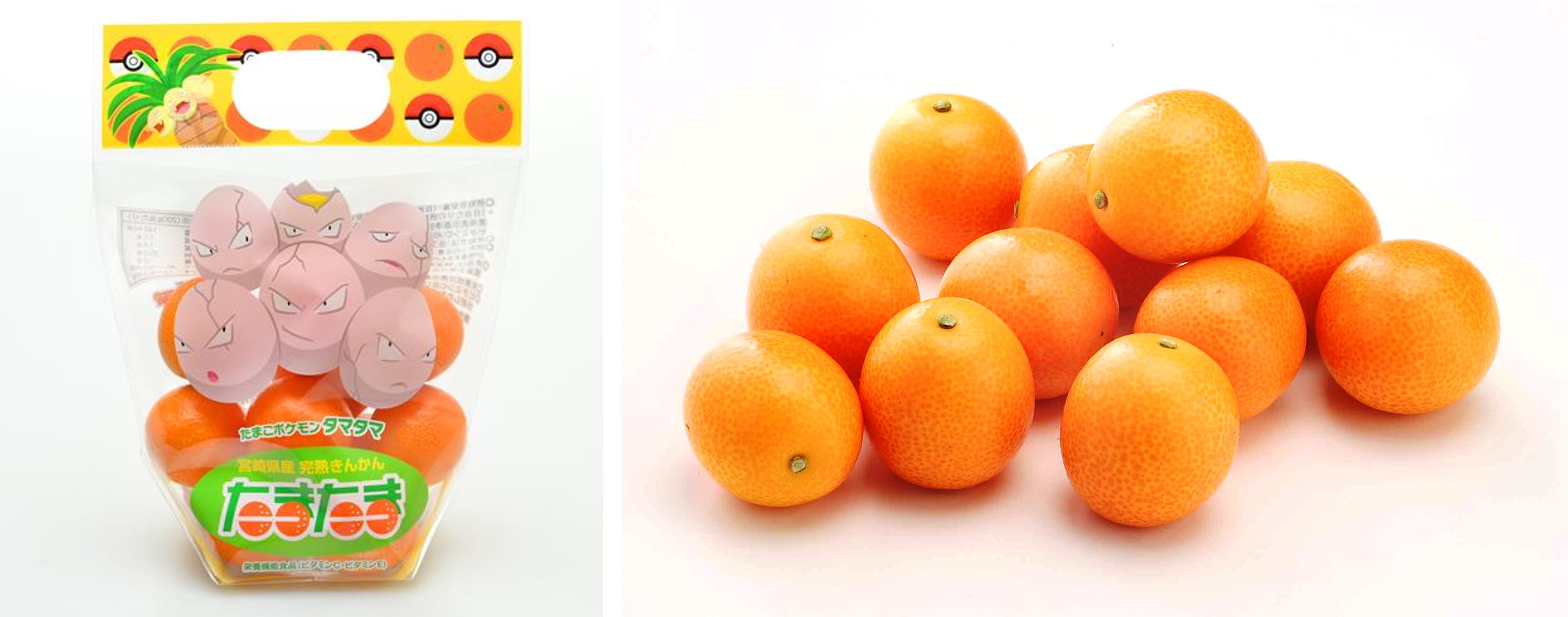 宮崎県名産の完熟きんかん「たまたま」が、「ナッシー」の進化前の姿であるたまごポケモン「タマタマ」の包装デザインで登場。完熟きんかん「たまたま」は、糖度16度以上、直径2.8cm以上の甘くて大きなきんかんで皮ごと食べられることが特徴です。