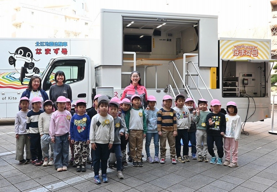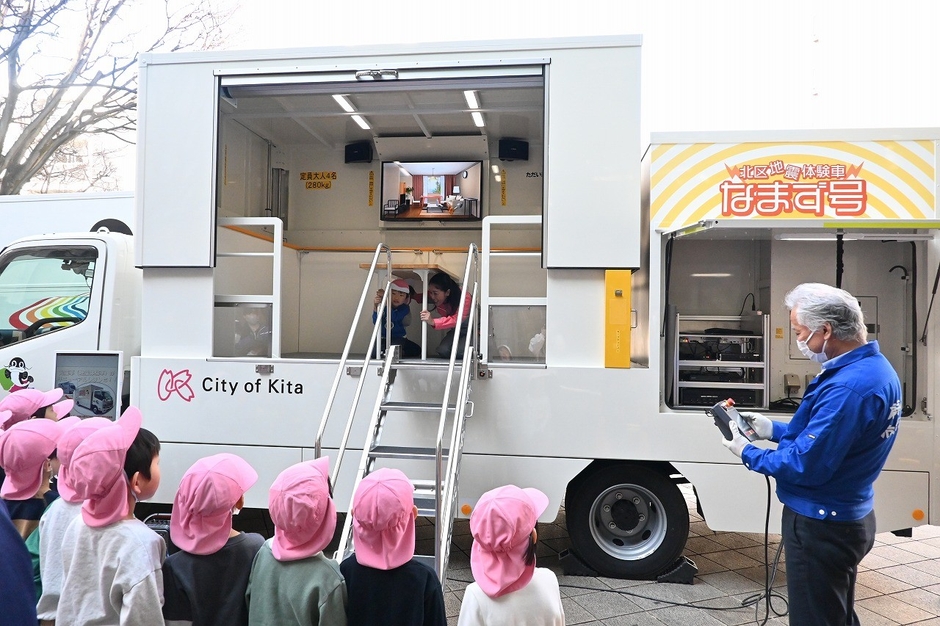 2月13日(金)、区は、北区役所第一庁舎中庭で新起震車「なまず号」のお披露目及び地震体験を実施し、滝野川保育園の園児たちや先生、来庁者の方々が参加した。