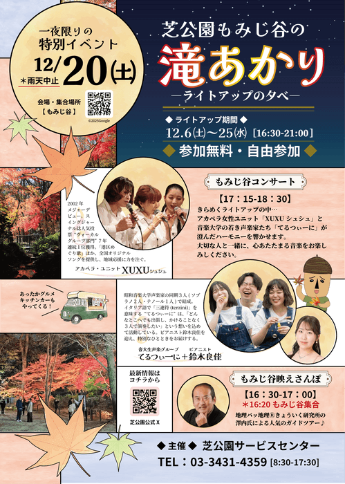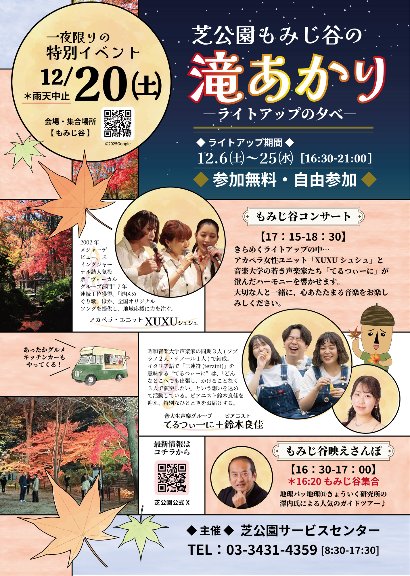【12/20開催】芝公園もみじ谷の<滝あかり―ライトアップの夕べ―>「もみじ谷コンサート」がさらにグレードアップ!