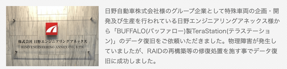 データレスキューセンター、BUFFALO(バッファロー)製 TeraStation(テラステーション)のデータ復旧をご依頼いただいた 日野エンジニアリングアネックス様によるお客様の声を公開