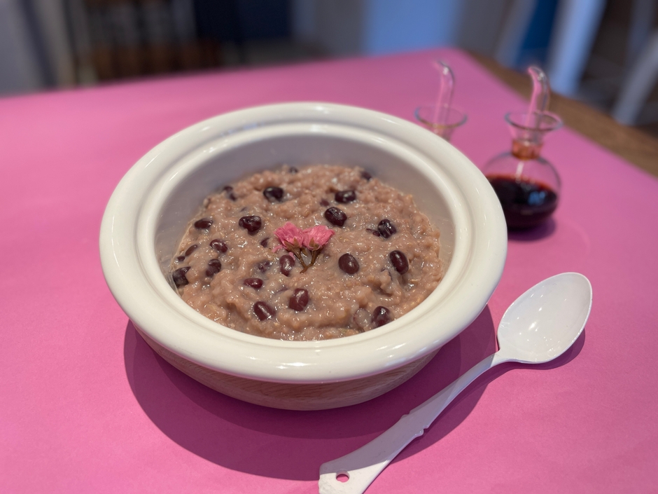 有機の小豆をふんだんに使い小豆の旨味や甘味をたっぷり感じられるお粥に、桜の塩漬けをトッピングしました。