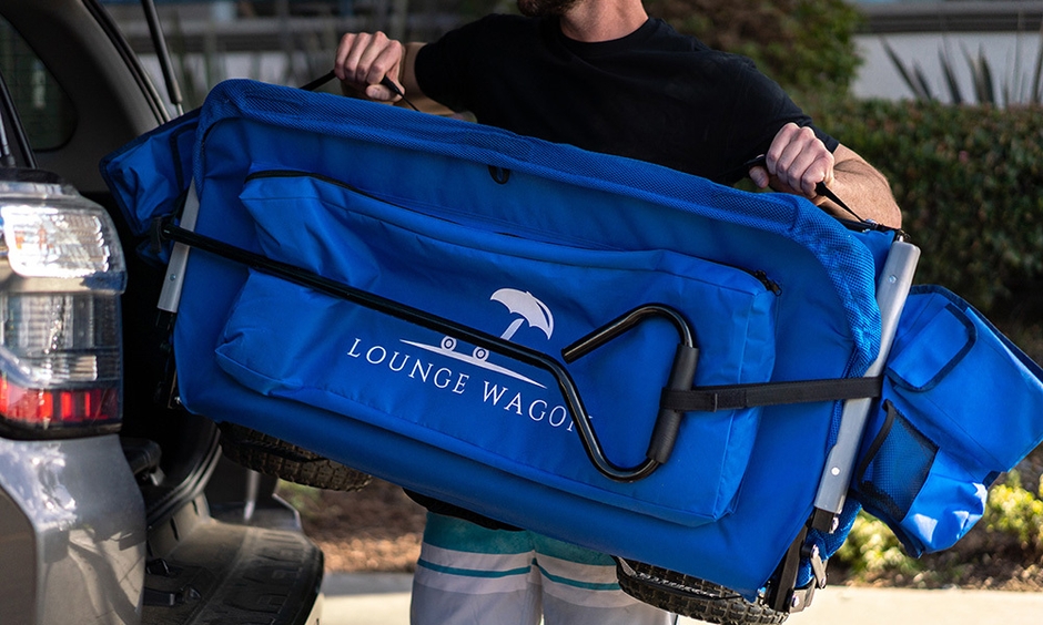 巨大パラソル付きでダブルチェアに変換できる、全地形対応 3in1 ユーティリティワゴン「LOUNG WAGON」は、砂、土、砂利、または凹凸のある道路を楽々と進める大型のスポーツホイール仕様となっています。