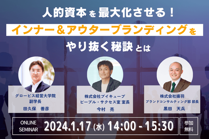 コーポレートブランディング支援を行う株式会社揚羽(東京都中央区 代表取締役社長 湊剛宏 以下、弊社)は、2024年1月17日(水)に、グロービス経営大学院 副学長 田久保善彦氏と株式会社ブイキューブ ピープル・サクセス室 室長 今村亮氏をゲストスピーカーに迎え、「人的資本を最大化させる!インナー&アウターブランディングをやり抜く秘訣とは」と題したセミナーを開催いたします。