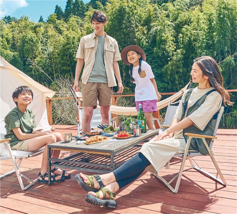 今回、初夏のウエアとこれからのアウトドアライフに活躍するハットやバッグ、チェアセットなどのグッズをマックハウスオリジナルでトータル展開いたします。メンズ、レディース、キッズともアースカラーをベースにカラフルなポケットを配したTシャツや、ロゴ入りボトムス等、タウンユースでもトレンド感を放つアイテムを揃えました。