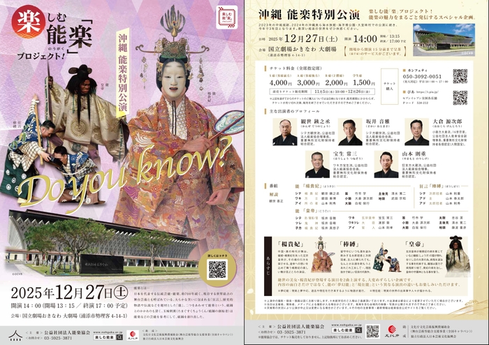 公益社団法人能楽協会主催、『楽しむ能「楽」プロジェクト!沖縄 能楽特別公演』が2025年12月27日 (土)に国立劇場おきなわ 大劇場(沖縄県浦添市勢理客4丁目14-1)にて上演されます。 チケットはカンフェティ(運営:ロングランプランニング株式会社、東京都新宿区、代表取締役:榑松 大剛)にて発売中です。