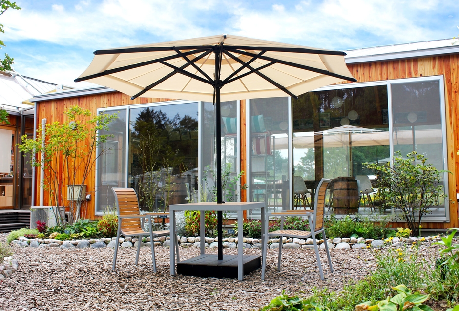 センターポールパラソルで多く見られるコンクリートやブロックがむき出しのベース部分に比べ、和風・洋風のどちらの雰囲気にも合う、すっきりしたデザインです。
