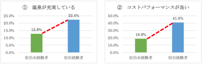 宿泊未経験者でも「温泉が充実している」は10%強、また「コストパフォーマンスが良い」に関しては20%弱の方がそのイメージを持たれていることが窺われます。