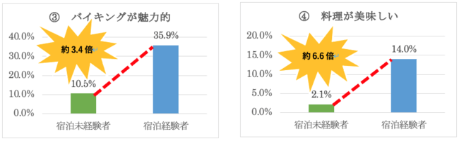 「バイキングが魅力的」という設問に対して、未経験者と経験者では3.4倍の差異が。「料理が美味しい」に至っては、6.6倍もの差異があることが分かりました。