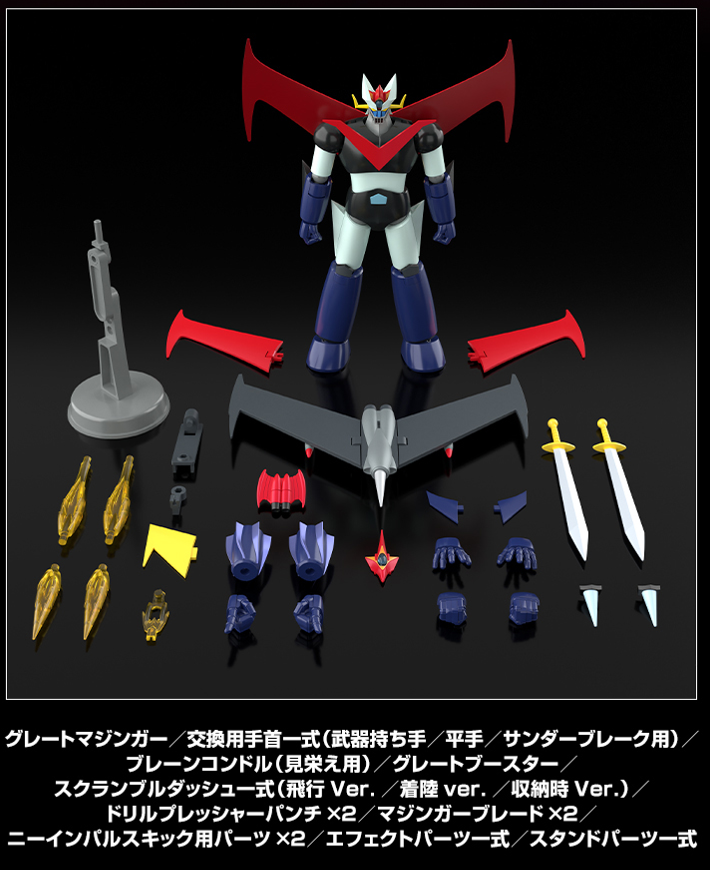 着脱可能なブレーンコンドルをはじめ、グレートブースター、マジンガーブレード、ドリルプレッシャーパンチ、サンダーブレーク用手首、ニーインパルスキック再現用パーツなど豊富なオプションパーツやエフェクトパーツが付属。グレートマジンガーをパワーアップして遊べるセット内容で商品化します。