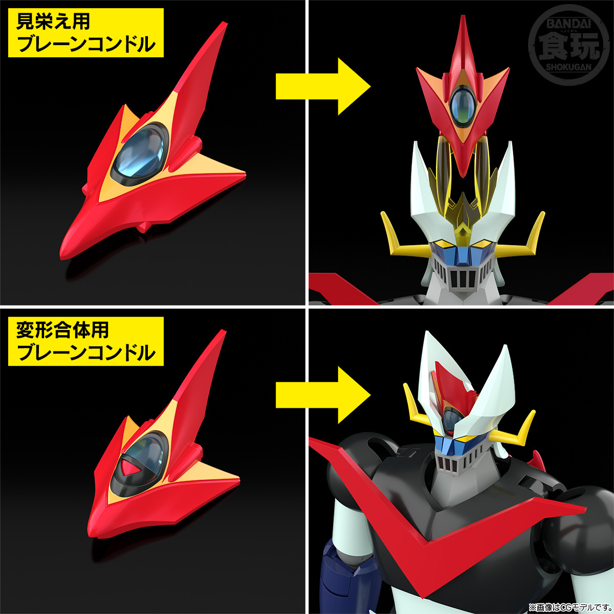 グレートマジンガーの操縦席となる小型戦闘機。頭部にセット可能な「合体用」の他に、単体での形状を重視した「見栄え用」のブレーンコンドルがプレミアムバンダイ限定品仕様として付属。