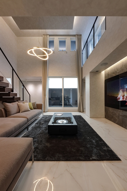 グラスルーチェや意匠性の高い照明・階段を採用し、上質で妥協のないリビング空間を演出。