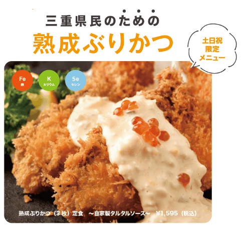 「熟成ぶりかつ」には、漁獲時期に応じて県産ぶりを使用します。その他食材も地元産にこだわることで、地産地消での三重県民の健康増進を目指します。