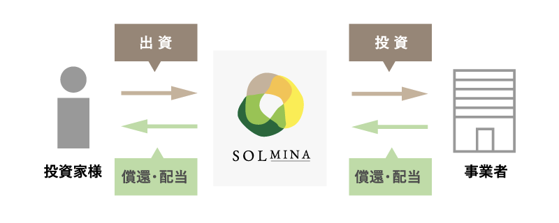 再生エネルギーにかかわる投資は、一般的に大口の投資が必要になりますが、SOLMINA(ソルミナ)では一口あたりの投資金額を小口にすることで、エコ投資に参加しやすい仕組みにしました。また、中長期の多種多様なファンド運用を取り扱いますので、事業の売上対象を消費者向け、且つ複数取り込むことで売上債権を分散し、様々なリスクをヘッジしながらミドルリターンを目指します。
