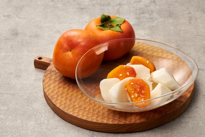 皮付大根と旬の富有柿を、糀を用いてすっきりとした甘酢漬に仕上げています。柿のやさしい甘さとポリポリとした大根の絶妙な組み合わせ。純正の調味料だけを使って仕上げた、季節の人気商品です。