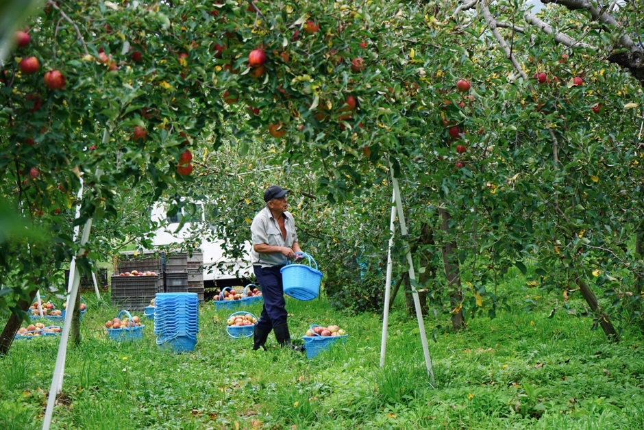 元々その地区は標高500m程で昼夜の寒暖差が大きく、日照時間も長いため、りんご栽培に最適です。更に、山々に囲まれた傾斜地で水はけが良く、新鮮な水が果汁たっぷりで甘味酸味のバランス取れたりんごに育ちます。