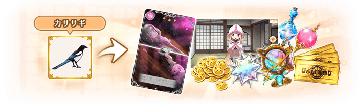 本イベントで獲得した「カササギ」は限定メモリア「血も想いも溶け合って」や限定ホーム背景「神浜の戦神子編」等、貴重なアイテムと交換できます。