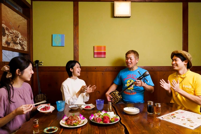 各お店には、OMOレンジャーがツアーのために用意した、沖縄でお馴染みの調味料セットを持参します。定番のお刺身も、お酢や島こしょう、島とうがらしやコーレーグースなどを使って、思う存分、沖縄風にアレンジ。本ツアー参加者だけのディープな那覇の楽しみ方です。