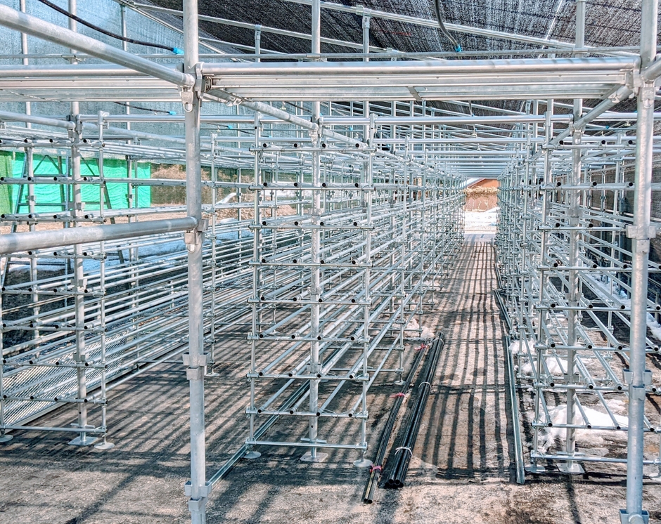 ハルカ社は2022年1月、本部農場内に営農型ソーラーハウスのモデル施設を着工。ソーラーパネルの重量負荷に耐えられるように、単管パイプを組み合わせて、キノコ菌床配置棚を施設構造と一体化させたモデルハウスを作りました。農水省の農研機構などの設計ガイドラインに沿った施工の上、実用新案の出願も行いました。ハルカ社では2022年春から、参入企業向けにモデルハウスなどを公開していきます。