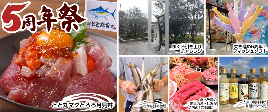 「小田原漁港とと丸食堂」では、5周年祭特別メニューをご用意しました。いましか食べられない豪華メニューをぜひご堪能ください。