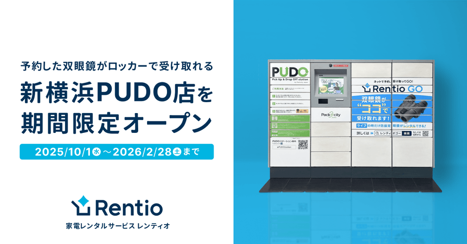 家電のサブスク・レンタルサービス レンティオ(Rentio)を手がけるレンティオ株式会社(所在地:東京都品川区、代表取締役社長:三輪 謙二朗、以下 レンティオ)は、Packcity Japan株式会社(所在地:東京都千代田区、代表取締役社長 CEO:柳田 晃嗣、以下 PUDO)と提携し、事前に予約した防振双眼鏡を宅配便ロッカー PUDOステーションで受け取れる「新横浜PUDO店」を、神奈川県横浜市港北区に2025年10月1日(水)~2026年2月28日(土)までの期間限定でオープンいたします。