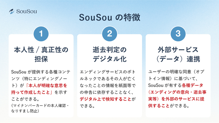 「SouSou」はマイナンバーカードを活用した新しいデジタル終活サービスです。エンディングノート等の終活に必要な様々な機能を、アプリ利用料完全無料・ワンストップで提供します。また従来のサービスにはない「①本人性/真正性の担保」・「②逝去判定のデジタル化」・「③外部サービス(データ)連携」という3つの特徴を備えており、今後は様々なパートナー企業との連携を通じて、ご逝去後の各種手続きの自動化・簡略化を目指します。