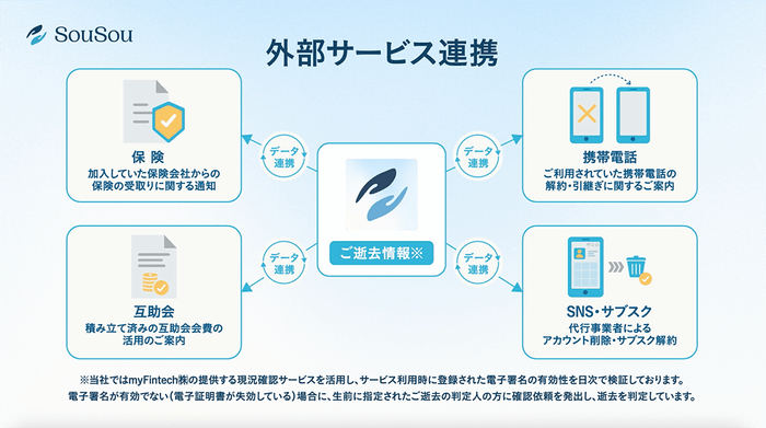 ご逝去をデジタル上で検知・判定することで、保険請求が必要となるタイミングを適切に捉えることが可能になります。 - 外部サービスとの連携