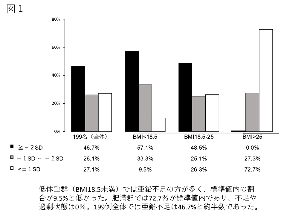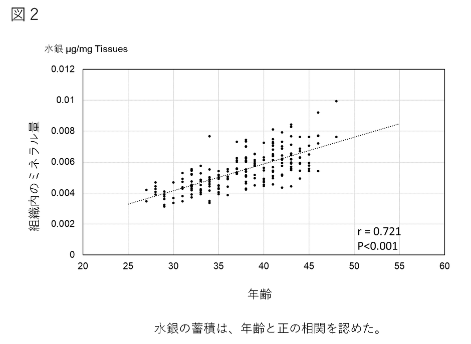 不妊に悩む199名の女性を対象にした体内ミネラルを分析した研究によって、(1)必須ミネラルの「亜鉛」は妊娠および妊娠の継続、胎児成長にとって重要であること、特に低体重(BMI 18.5未満のやせ型)女性は妊娠前から「亜鉛」不足の改善を意識する必要があること(図1)、(2)有害ミネラルの「水銀」は自閉症児との関連を指摘されており、特に肥満や高齢妊娠の女性は妊娠前から「水銀」デトックスの食生活や生活習慣のアドバイスが重要となること(図2)、(3)ミネラルバランスをととのえるためには、個々の消化吸収力や体内ミネラルの状況を加味し、個別性・最適性に基づいた新たな食育が求められること、を明らかにしました。