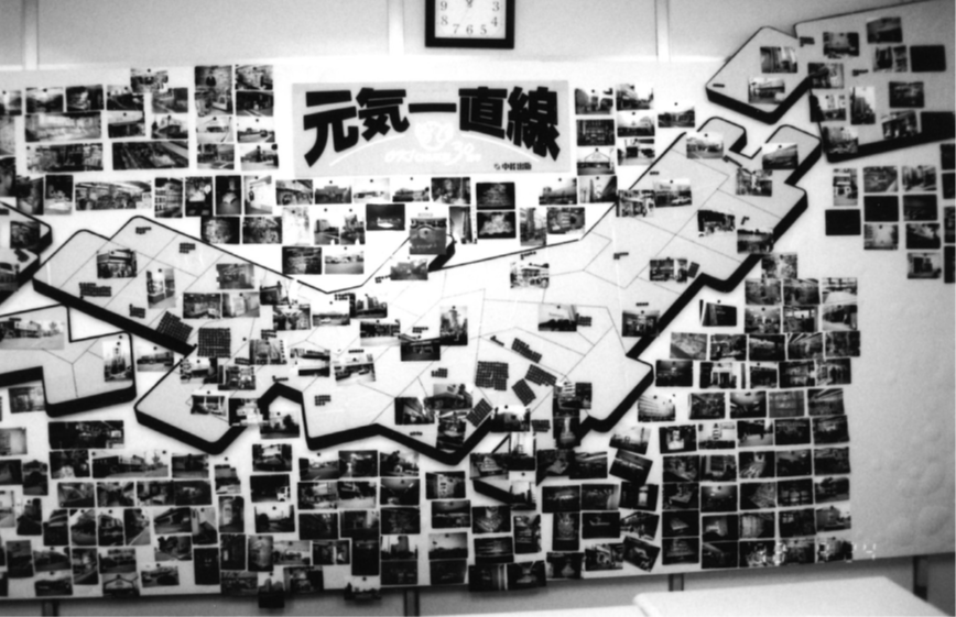 2000年、会議室の壁一面に、全長5メートル、幅2メートルの巨大な日本地図(白地図)が掲げられた。営業部のミレニアム・イベント「第1回スタンプラリー全国2000店制覇」の進捗が一目でわかるようデザイン室が制作したパネルである。