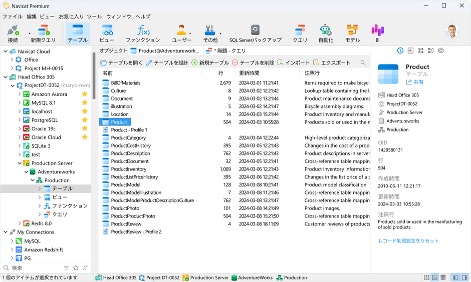 Navicat は、業界をリードするデータベースの管理と開発を行うソフトウェアです。そのトップ製品の1つであるNavicat Premiumは、1つのアプリケーションから MySQL、Redis、PostgreSQL、SQL Server、Oracle、MariaDB、SQLite、MongoDBデータベースに同時に接続することができます。また、Amazon RDS、Amazon Aurora、Amazon Redshift、Amazon ElastiCache、Microsoft Azure、Oracle Cloud、Google Cloud、MongoDB Atlas、Redis Enterprise Cloudなどのクラウドデータベースと互換性があり、さらにNavicat PremiumはGaussDBおよびOceanBase データベースとも互換性があります。Navicatを用いることで、データベースの構築、管理、保守を迅速かつ簡単に行えます。