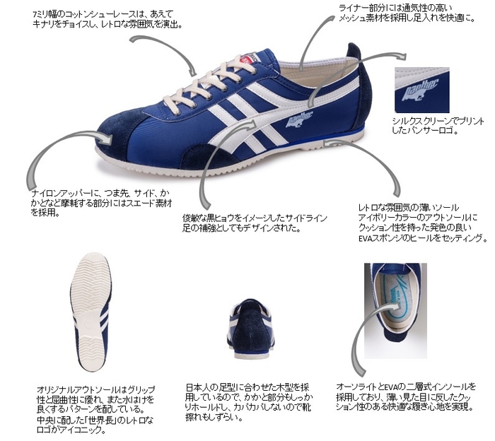 1964年に東京で開催された世界的スポーツの祭典と時を同じくして誕生したスポーツシューズブランド「Panther(パンサー)」。黒ヒョウをイメージした俊敏さにあふれるデザイン性と軽快なフォルムで70年代にはトレーニングシューズの代名詞として多くのトップアスリートから愛用され、全国の学校指定靴として採用されるほど人気を博しました。