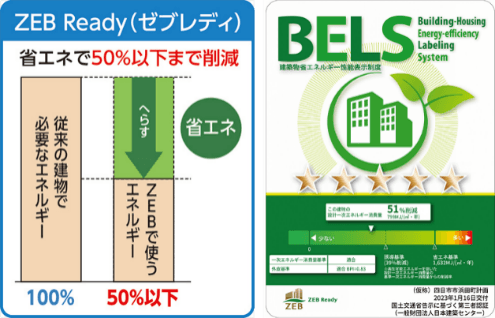 エネルギー負荷の抑制、高効率な照明・空調機器の導入により、50%以上の一次エネルギー消費量の削減に適合した建築物として「ZEB Ready」認証を取得しています。