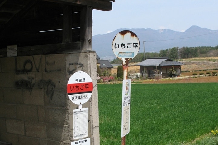 長野県小諸市でいちごの生産が始まったのは明治時代です。標高が600m~2000mに位置します。冬は寒い一方で夏は涼しい、年間を通じて降水量が少なく、昼夜の寒暖差もあるなど、いちご栽培に適した気候が生産を盛んにした要因のひとつです。なかでもいちごが群生していた御牧ヶ原台地は露地栽培が盛んでした。いちご生産発祥の地と伝えられ、今も「いちご平」という地名が残っています(写真上:バス停 いちご平)。また、明治14年には塩川伊一郎氏によって、小諸いちご平産缶詰イチゴジャムを販売。日本で初めての民間のイチゴジャム製造企業も誕生しています。この原料として使われた品種は、酸味と香りが強く、加工品種として優れていたため、昭和14年に農水省指定試験で選抜されました。「御牧ケ原1号、2号」(以降「御牧いちご」)と名付け、品種改良の親としても使われています。