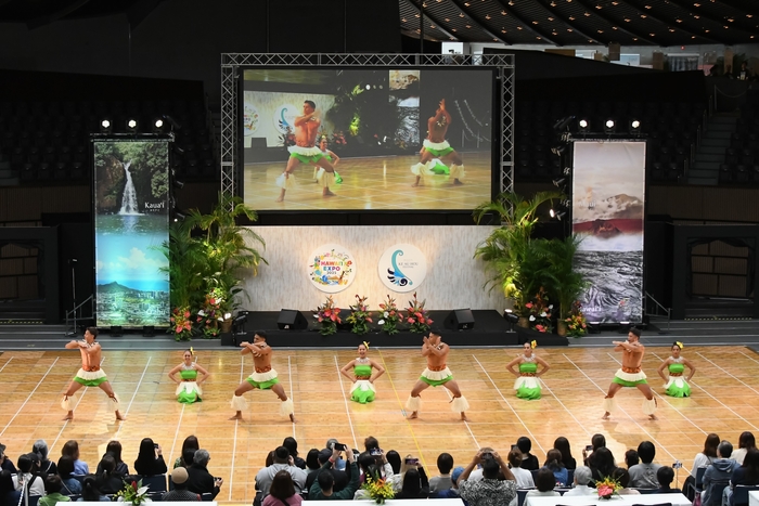 今年は、毎年実施している「HAWAIʻI EXPO」のステージ、ワークショップ、出展ブースに加え、フラコンペティション「Ke Au Hou Festival」との初共催によって、より本格的なハワイ文化に触れる貴重な機会となりました。来場者は広い会場で着席し、フラの表現力や芸術性を競い合うコンペティションを楽しむ様子が見られました。