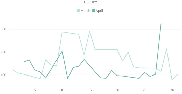 ドル円(USD/JPY)の3月と4月のボラティリティ推移を比較した上記グラフから、4月は3月に比べて全体的なボラティリティの鈍化傾向が見られました。1日当たりの平均ボラティリティは4月が127.7pipsと、3月の165.1pipsに比べ約37pips減少しています。ただし、4月のドル円は28日に323.3pipsという最大値を記録し、3月の最大ボラティリティ289.9pipsと比べて約33pips上昇しました。同日は日銀総裁による会見および金利決定が行われ、日銀の新リーダーである植田総裁の政策は「大規模な金融緩和の維持」に決定しました。日本市場の流動性を高め経済活動を促進するという、これまでの金融政策の継続が決定し、円安が進む結果となっています。