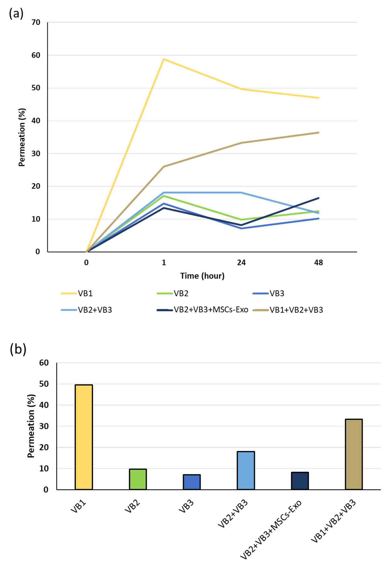(b)24時間後の透過率が最も高かったのは、VB1単独の49.6%で、次に高かったのはVB1+VB2+VB3の33.3%だった。