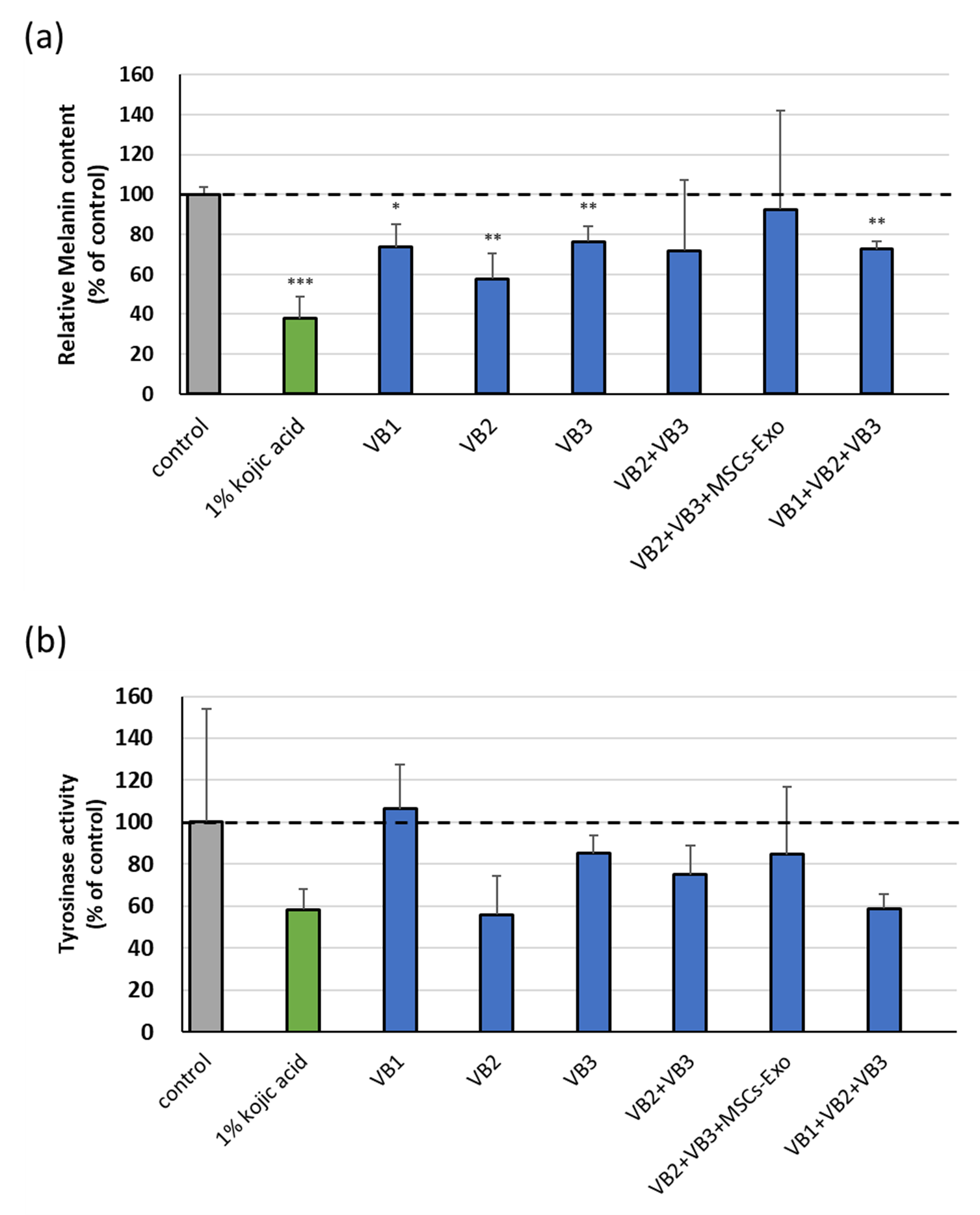 チロシナーゼ活性は、各群とも有意な差は得られなかったが、メラニン量が低いVB2単独、VB1+VB2+VB3併用では、1%kojic acidと同等レベルまでチロシナーゼ活性を抑制する傾向がみられた。