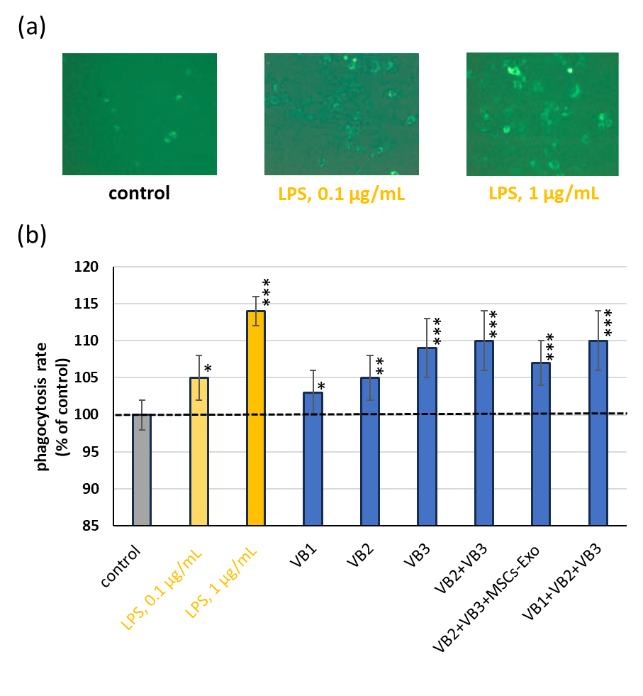 (b)その評価系を用いてVBの貪食能を測定した結果、各群において有意な上昇が確認された。特にVB3では、強い活性を示し、VB2やVB1との併用によって、効果が阻害されることはなかった。