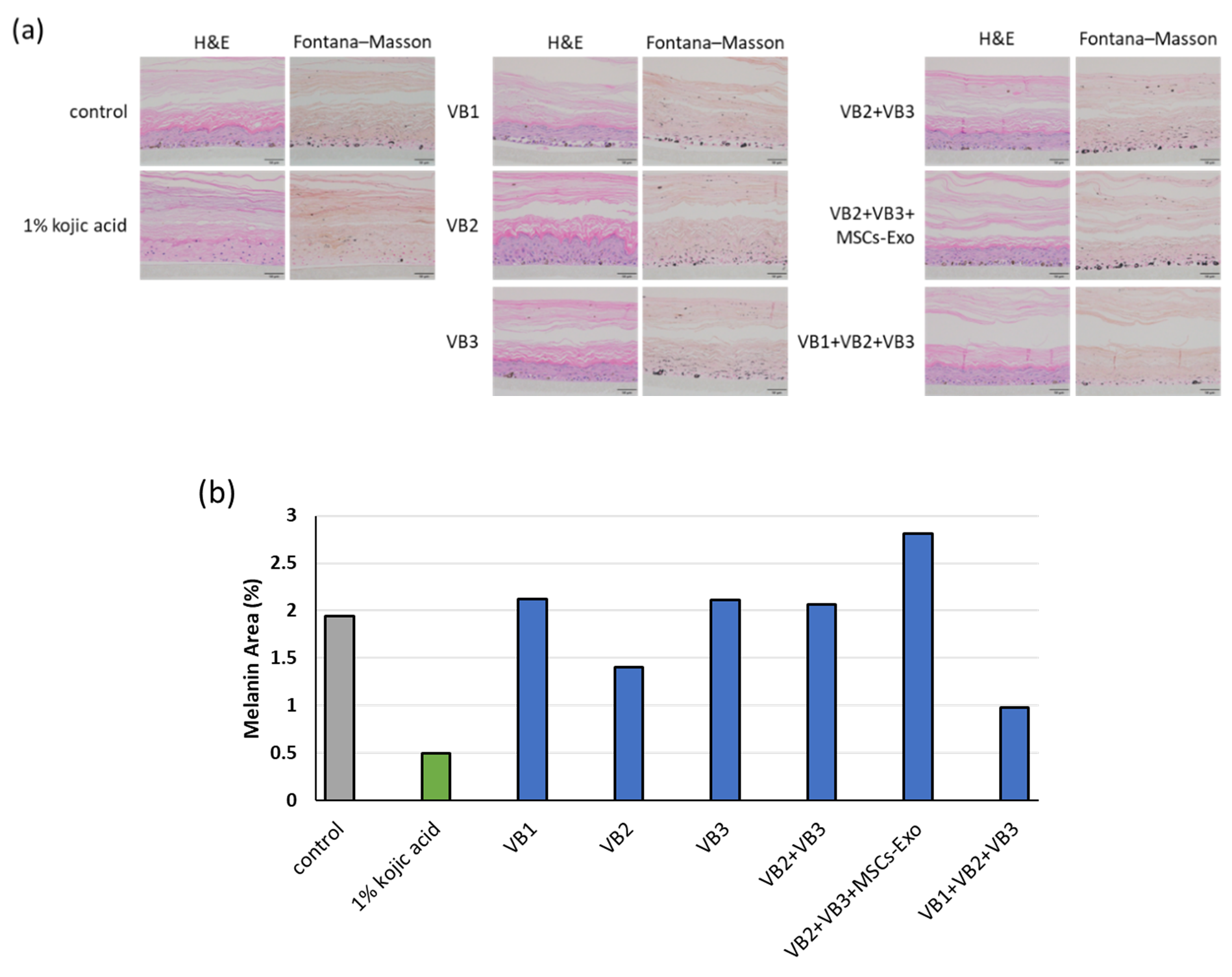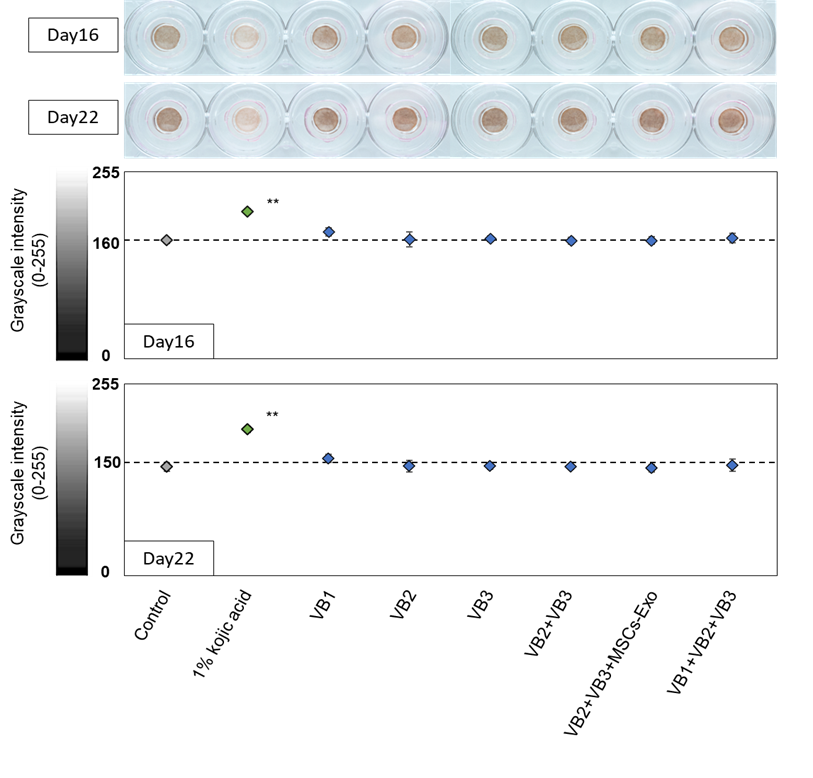 1%kojic acidでは明らかなメラニンの減少が確認された。またVB2単独、VB1+VB2+VB3でもメラニンの減